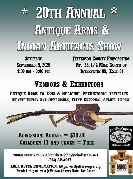 Join the Jefferson County History Center and North Fork Chapter 29 of the Society for Pennsylvania Archaeology at the 20th Annual Antique Firearms and Indian Artifact Show on Saturday, September 5 from 9 a.m. - 3 p.m. at the Jefferson County Fairgrounds. Bring the family and explore two buildings with over 100 tables of exhibitors and vendors from across the state.